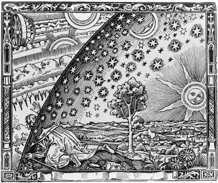 Flammarions Holzstich, Wanderer am Weltenrand, Paris 1888, Quelle Wikipedia