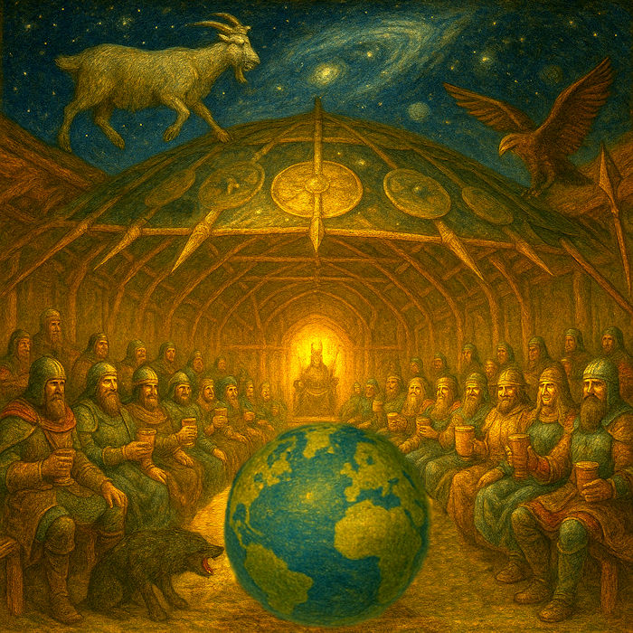 Wichtig ist, zu erkennen: Die Einherier üben nicht außerhalb der Schöpfung, sondern innerhalb der Schöpfung. Walhall ist kein abgetrennter Übungsraum über den Welten, sondern ein Bewusstseinsraum im Allbewusstsein Odins und damit im Herzen der Schöpfung selbst. Alles, was dort gedacht, gefühlt und gelernt wird, fließt in die ganze Schöpfung ein. Und was lernen und üben die Einherier? Mut und Ausdauer, Gottvertrauen und Angstlosigkeit vor allem vor dem Sterben und Verlieren im Kampf, ein bewusstes Leben und ein bewusstes Sterben, wie es auch manche Nahtoderfahrungen berichten. Also ein göttliches Bewusstsein, das wir auch als „ganzheitliche Vernunft“ bezeichnen und als höchste Begabung der Menschen betrachten. Denn nur in der Ganzheit kann nichts mehr verlorengehen, und diese erkennt man, wenn man sich als reines Bewusstsein selbst in allem erkennt. Entsprechend ziehen die Einherier auch furchtlos in den letzten großen Kampf von Ragnarök, denn sie wissen, dass selbst dort nichts Wahres verlorengeht, weil die Wahrheit bleibt.