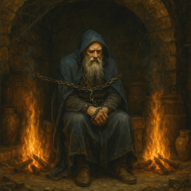 Dann fragt ihn der König, wer sich hinter dem Namen „Grimnir“ als „Maskierter“ verbirg? Ähnlich würden wir heute fragen, wer sich hinter jemandem verbirgt, der sich „Person“ nennt. Denn Person kommt von lateinisch „persona“ und bedeutet auch nur „die Maske eines Schauspielers“. Doch er bekommt keine Antwort auf seine Frage. Warum nicht? Odin hätte ihm sicherlich gern geantwortet. Aber wie könnte ein Ego als Bewusstsein der Trennung den göttlichen Geist der Einheit verstehen? Daraufhin versucht das Ego, diesen Geist in seine Welt der Trennung und Gegensätze zu zwingen und setzt ihn zwischen zwei Feuer. Darin könnte man die leidenschaftlichen Feuer von Begierde und Hass erkennen, wie auch alle anderen Gegensätze von Geburt und Tod, Gewinnen und Verlieren oder Mein und Dein, die in einem Ego-Bewusstsein bedrohlich und marternd brennen.