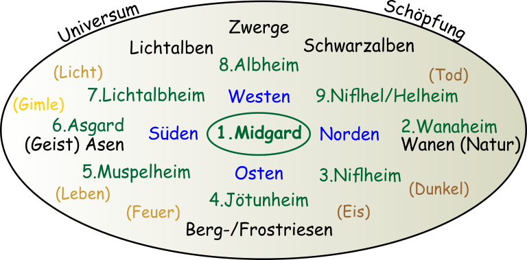 Wenn wir diesen Ansatz nun weitertreiben und das Wesen der unterschiedlichen Welten betrachten, wie sie in der Edda beschrieben werden, dann können wir die beiden Welten der Riesen und Zwerge als Makro- und Mikrokosmos gegenüberstellen, sowie die beiden Welten der Asen und Wanen als die Reiche von Geist und Natur. Weitere Gegensätze bilden Licht und Dunkel, sowie Leben und Tod. Setzt man nun die Riesen in Richtung Osten, dann können wir uns folgendes Bild vorstellen:
