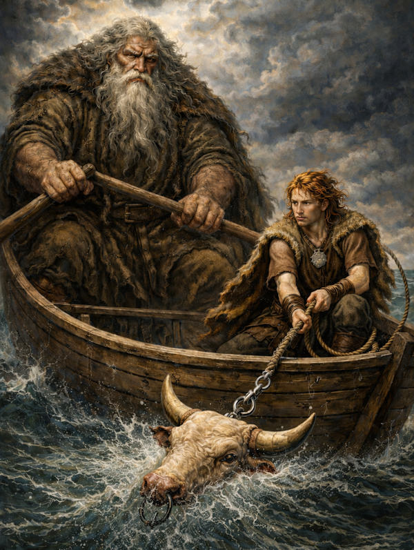 Er fragte Hymir, was sie als Köder benutzen sollten, doch der empfahl ihm, sich selbst einen Köder zu besorgen. Da ging Thor dorthin, wo er eine Ochsenherde sah, die Hymir gehörte. Er packte den größten Ochsen, der Himinhrjodr hieß („Himmelszerstörer“), riss ihm den Kopf ab und ging damit zum Strand. Dort hatte Hymir mittlerweile sein Boot ausgesetzt. Thor ging an Bord und setzte sich hinten auf den Schöpfraum. Er nahm zwei Ruder und ruderte, doch Hymir glaubte, sie bewegten sich wegen seines Ruderns. Denn er saß ganz vorn im Schiff und ruderte schnell. Dann sagte er, sie seien zu den Gründen gekommen, über denen er zu sitzen gewohnt sei, um Flundern zu fangen. Aber Thor meinte, er wolle noch weiterrudern, und so fuhren sie noch schnell eine lange Strecke. Schließlich sagte Hymir, sie seien so weit hinausgefahren, dass es wegen der Midgardschlange gefährlich sei, hier draußen zu bleiben. Thor jedoch wollte noch eine Weile weiterrudern und tat dies auch. Hymir war allerdings in äußerst schlechter Laune.