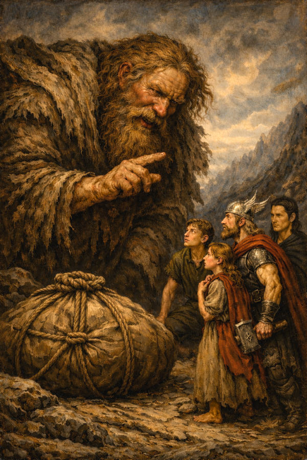Dazu meinte Utgardloki: „Nun will ich dir die Wahrheit sagen, da du aus der Burg heraus bist. Solange ich lebe und zu bestimmen vermag, sollst du niemals wieder in sie hineinkommen. Und ich weiß gewiss, dass du niemals hineingekommen wärst, wenn ich vorher gewusst hätte, wie groß deine Kraft ist. Damit hättest du uns beinahe in größte Gefahr gebracht. Aber ich habe dir Sinnes-Illusionen vorgegaukelt. Das erste Mal traf ich mit euch schon im Wald zusammen. Als du den Proviantsack aufbinden wolltest, hatte ich ihn mit Eisendraht zugebunden, und du fandest nicht heraus, wie er zu lösen war. Als Nächstes hast du mir drei Schläge mit dem Hammer versetzt. Der erste war der schwächste, und er war doch so stark, dass er mir den Tod gebracht hätte, hätte er richtig getroffen. Aber bei meiner Halle hast du einen Berg gesehen, darin waren drei viereckige Täler, und eines war besonders tief: Das waren die Spuren deiner drei Hammerschläge. Diesen Berg schob ich deinen Schlägen entgegen, aber du hast es nicht bemerkt.“