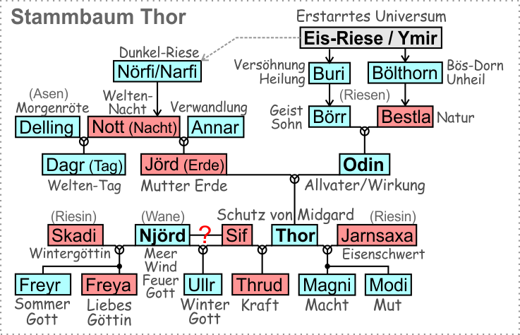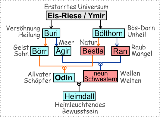 Im Prinzip könnten wir bezüglich der „neun Welten“ auch an die mystischen „neun Schwestern“ denken, die von Ägir als „Meer“ erzeugt wurden, sozusagen wie neun schöpferische Wellen auf dem Meer der Ursachen, also Bereiche des Lebens und der Bewegung in der Schöpfung, die entstehen und vergehen. Geboren wurden sie von Ran als „Raub“ oder „Mangel“, die wir als Prinzip des „Unheils“ vom Ur-Riesen Bölthorn ableiten könnten, dem „Bös-Dorn“: