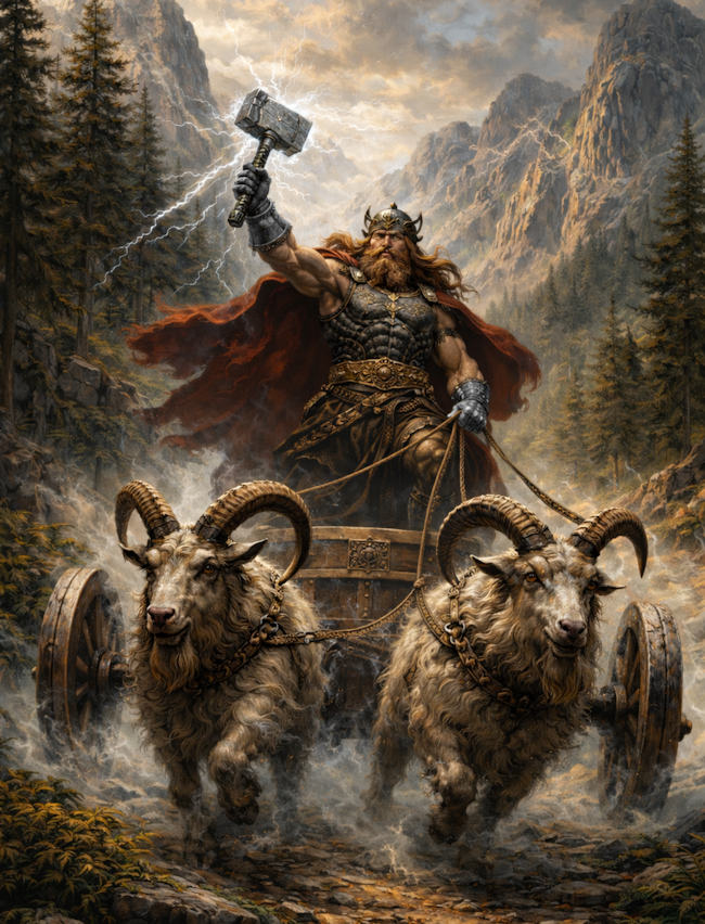 Thor hat zwei Böcke, die Tanngnjost und Tanngrisnir heißen („Zähneknirscher“ und „Zähnefletscher“), und einen Wagen, wenn er ausfährt; und die Böcke ziehen diesen Wagen. Er besitzt außerdem drei Kostbarkeiten: Als erstes den Hammer Mjölnir („Zermalmer“), den die Frost- und Bergriesen gut kennen, wenn er durch die Luft geschwungen wird. Und das ist nicht verwunderlich, denn er hat so manchen Schädel ihrer Väter und Verwandten zerschmettert. Die zweite hervorragende Kostbarkeit, die er besitzt, ist ein Kraftgürtel. Wenn er ihn sich anlegt, erwächst ihm die doppelte Asenstärke. Aber er hat noch eine dritte große Kostbarkeit: Das sind Eisenhandschuhe. Am Hammerschaft kann er sie nicht entbehren. Niemand jedoch ist so klug, dass er seine ganzen Heldentaten aufzählen könnte. Doch ich kann dir so viele Geschichten von ihm erzählen, dass die Zeiten vergehen würden, bevor alles gesagt wäre, was ich weiß.